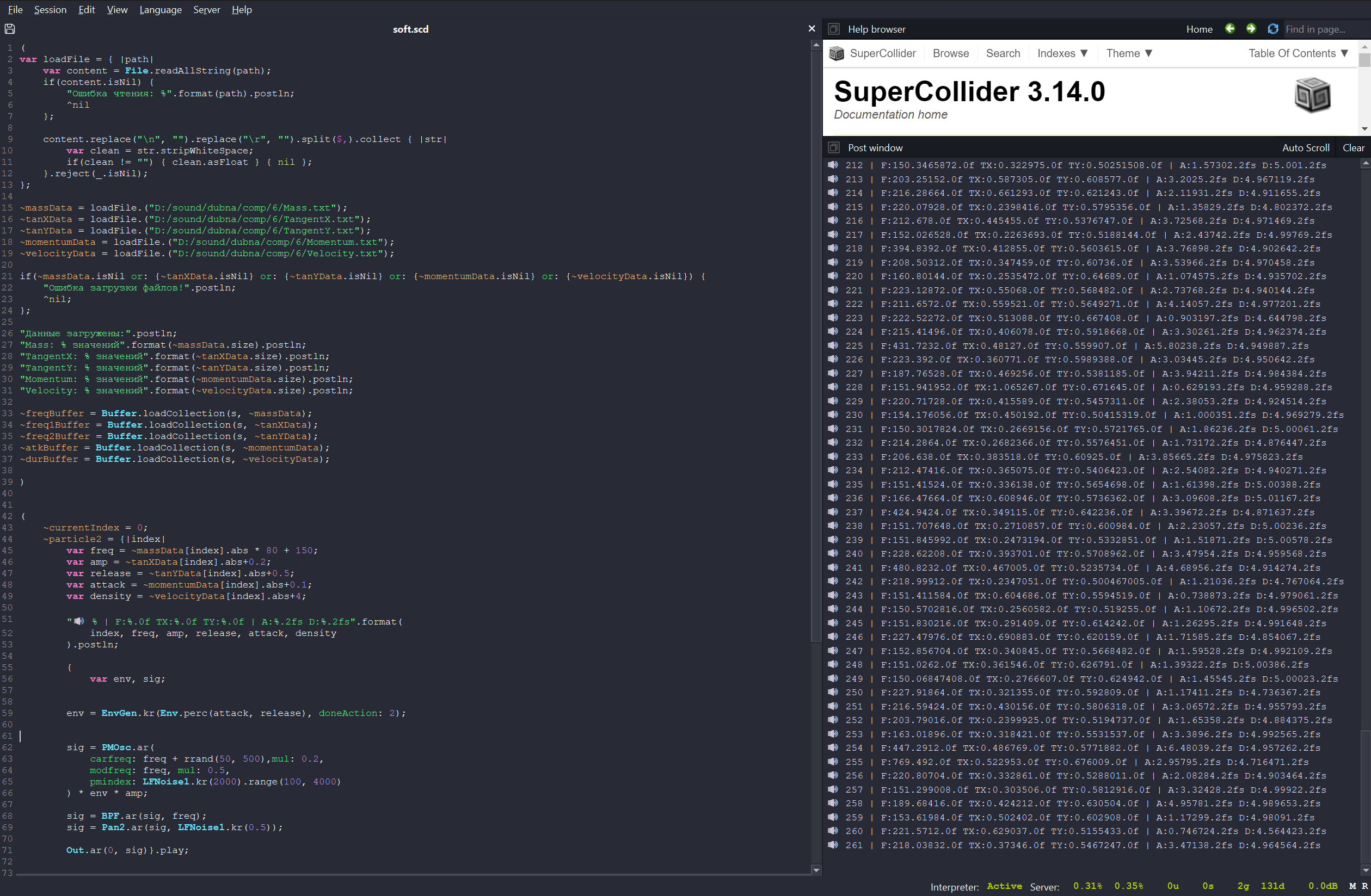 В своей основе SuperCollider является воплощением идеи алгоритмической композиции. Вместо создания фиксированной аудиодорожки пользователь определяет набор правил, процессов и динамических систем, которые самостоятельно генерируют музыку. Именно эта способность в реальном времени обрабатывать потоки данных и преобразовывать их в звуковые параметры делает SC идеальным инструментом для сонификации — как в нашем проекте по озвучиванию данных с коллайдера.